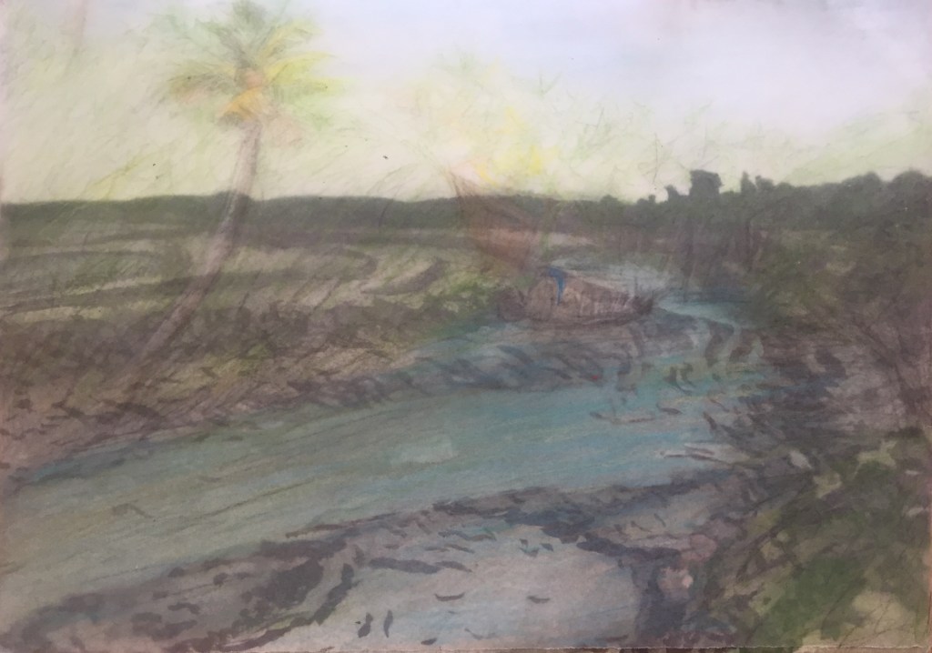 This year for art we have to do a piece about colonialism. I decided to take a different approach to this project and illustrate someone else’s opinions on colonialism. This piece is based off the book “The God of Small Things” by Arundhati Roy which I studied last year. In the book, the characters are heavily affected by the colonialism of India, where they live. A central image of the book is the river. When the children in the book were young it was green and lush but when they return as adults it is dead and dry. This is not entirely fictional, the book is set at a real river that is actually dying. I based the rivers I drew on two pictures of the actual river from where the book took place. To create this piece I layered wax paper on top of a watercolour I did. With the watercolour, I wanted to make it stand out so I went back in with gouache in some areas to add details and darken parts. On the wax paper I used pencil crayon, which ended up showing more translucent than I thought it would. I had originally used a paper that was more brown and showed less of the background and slightly more colour from the pencil crayons but it disappeared so I had to redo it. I tried using white tissue paper after this which really brought out the colour of the pencil crayon but it ripped too easily. I finally settled on the translucent white wax paper. My idea behind using the wax paper on top was to show the progression over time. the final result looked a lot more faded than I imagined but I think it works with the idea.