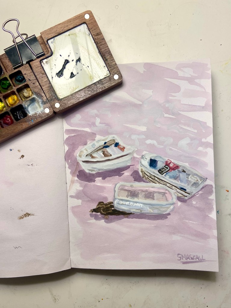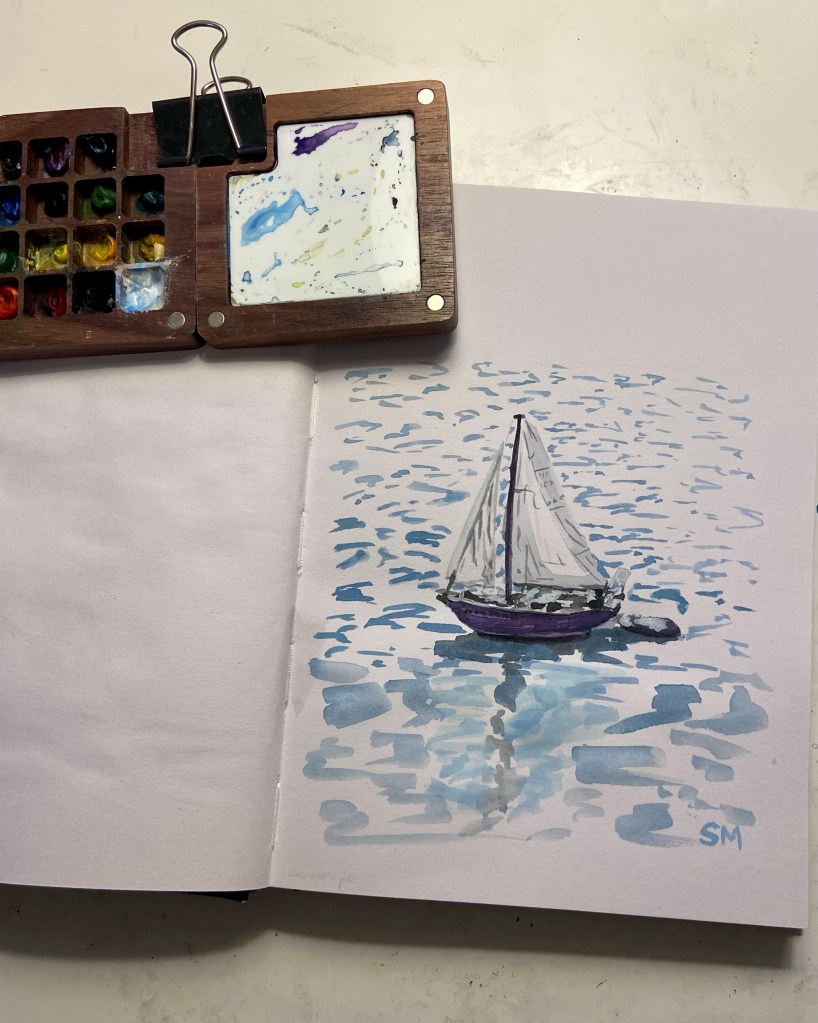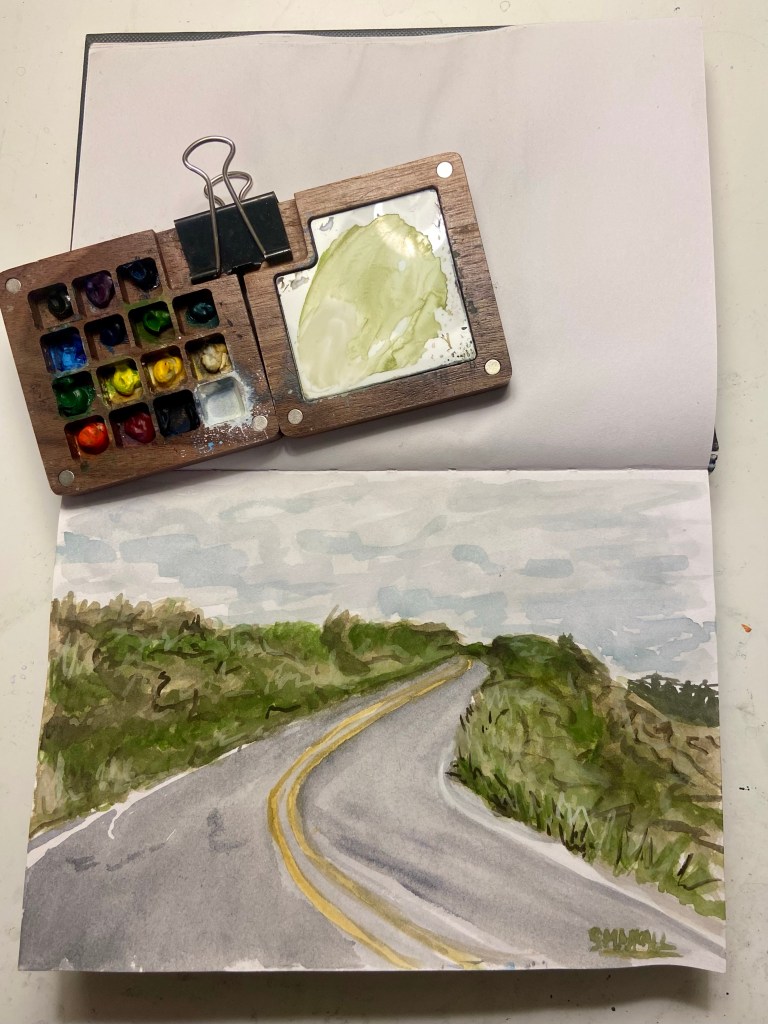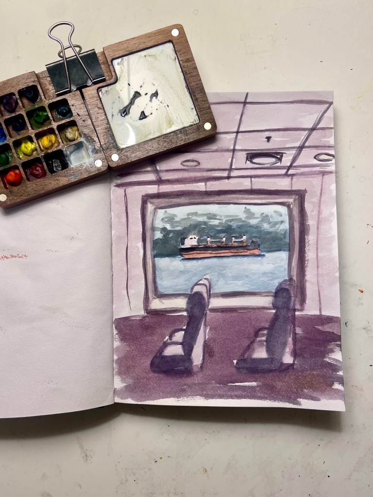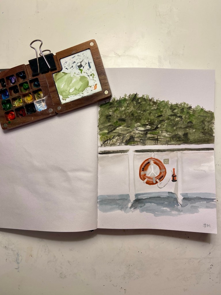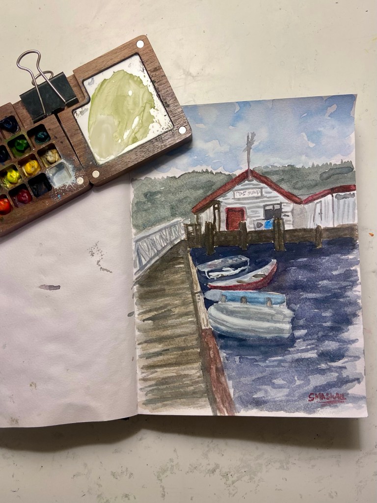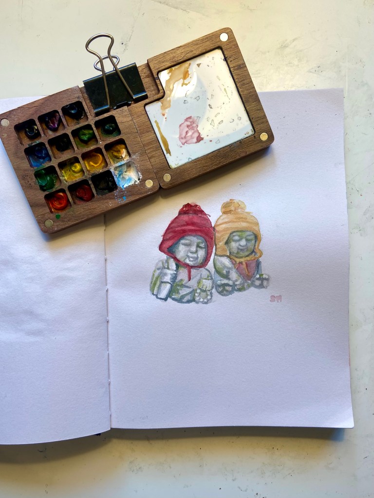 The majority of these sketchbook pages are local scenes – you can very clearly see how much inspiration I draw from living on the west coast, close to the ocean. But I did draw two little statues from Japan – this was a photo I took on my film camera and then the focus was all wrong so I decided to fix it in watercolour.