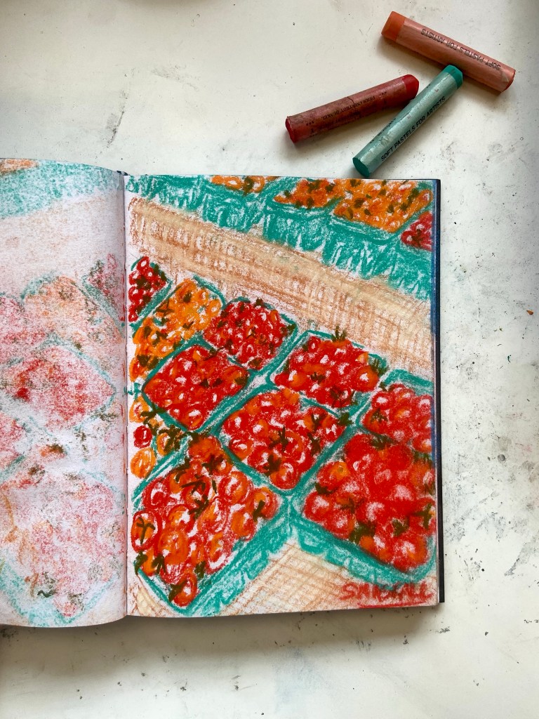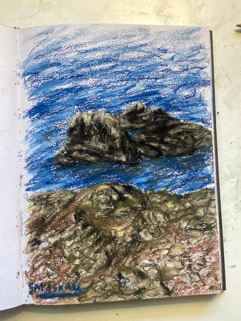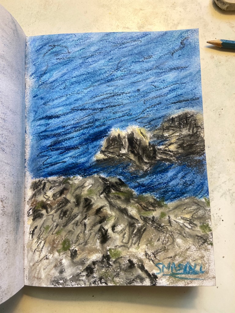 I tested out some colours and techniques in my sketchbook first using a corner of the image and then put it on paper. There are some things I can definitely still work on with pastel but overall I like how this came together.