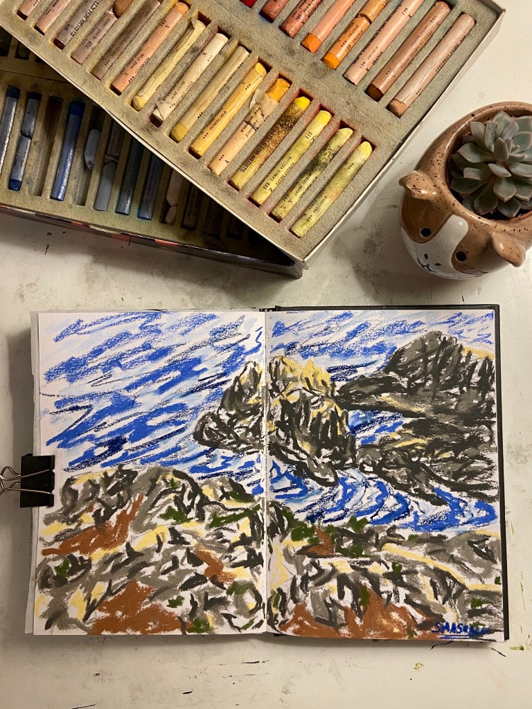 I tried a few in a similar style of these mountains in watercolour that I’ll post soon too, but I really love the texture of pastel for this scene. I might even turn it into a full scale piece since every time I’ve drawn these mountain scenes part of the mountains or the lake below gets cropped out and I want to draw it all in one piece. But that will be coming in the future!