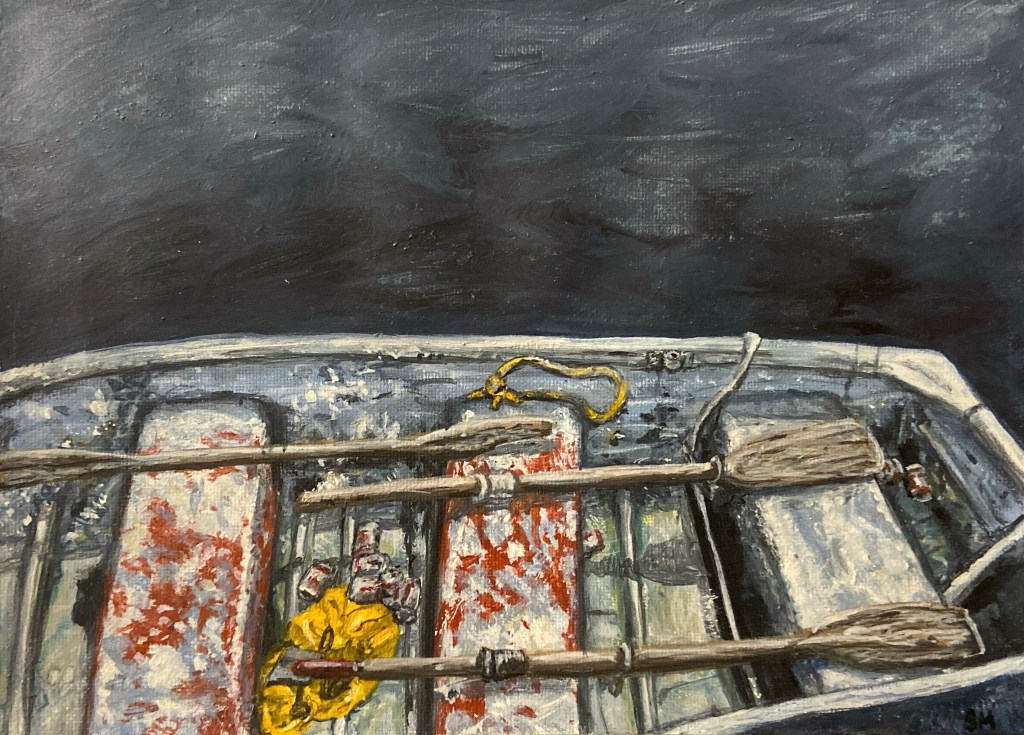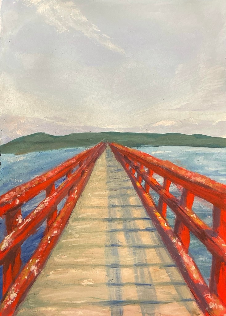 I’ve been trying to adopt more of a “Bob Ross” or Lynchian mindset, acting more on instinct and embracing the “happy accidents” that result from this. I’m still trying to find my exact artistic voice but I think there’s been a big change compared to the artwork I was creating in high school. The painting above, for example, I was more focused on the dingy, dirtiness and the texture of the piece, using more visible brush strokes to suggest aging, peeling, and grain. I did have some issues in the water with the paint coming off when I tried to layer on more – I think I unfortunately was using some cheaper paints. But I’ve restocked my Holbein paints since then so I shouldn’t have that problem again.