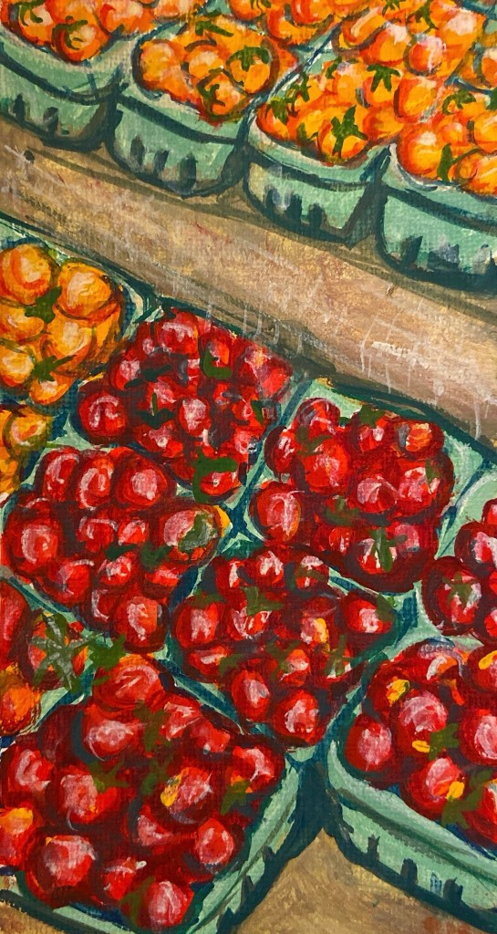 This first painting of the tomatoes is probably true to size on whatever screen you’re looking at it from (very very small). I had one remaining small scrap of acrylic paper so I used to for this small tomato painting. For this piece, I wanted to focus the bright colours and contrast between them.