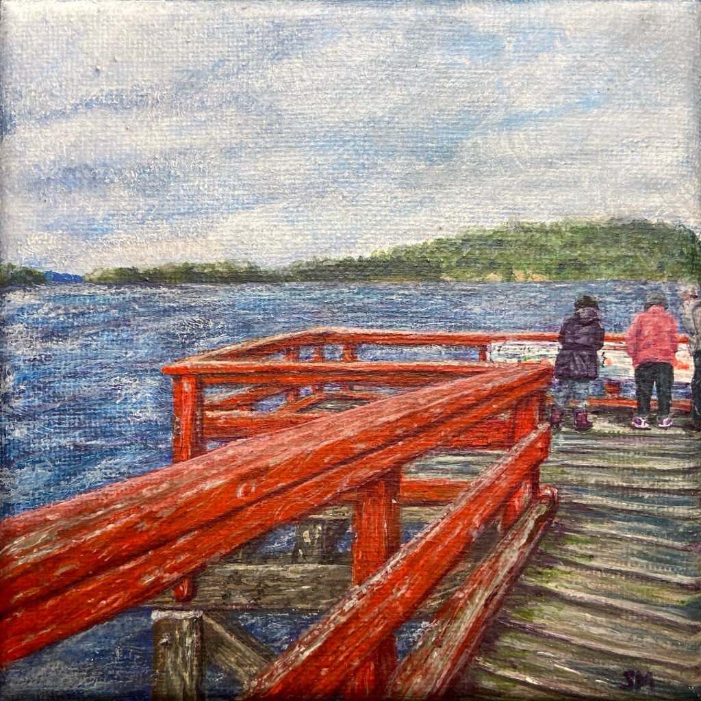 This was a tiny square canvas I had – I have a second one to paint still. I really love painting wood grain, mossiness, and peeling paint. This wasn’t my first painting of this dock and I’m sure it won’t be my last. I think I could’ve done more with the background in this. I didn’t go in with any big idea except to copy the photograph I took and add purple into the shadows (expect to see a lot more purple in upcoming pieces). I think I could have darkened or faded out the background more. I do really love the dock itself though.