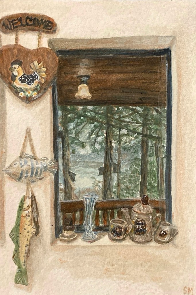I thought I’d be painting scenes of Japan but I settled on a scene from home. I took some haphazard photos before I left of my grandmas cabin, so I could embellish and edit them how I wanted. This piece is of the kitchen window – the view you get while you wash dishes. It’s full of all typical grandma knickknacks: an assortment of ceramic and wooden fish, a tea set decorated with a family of raccoons, and a random sign of a rooster. Beyond that you can see the trees and lake in the distance.
