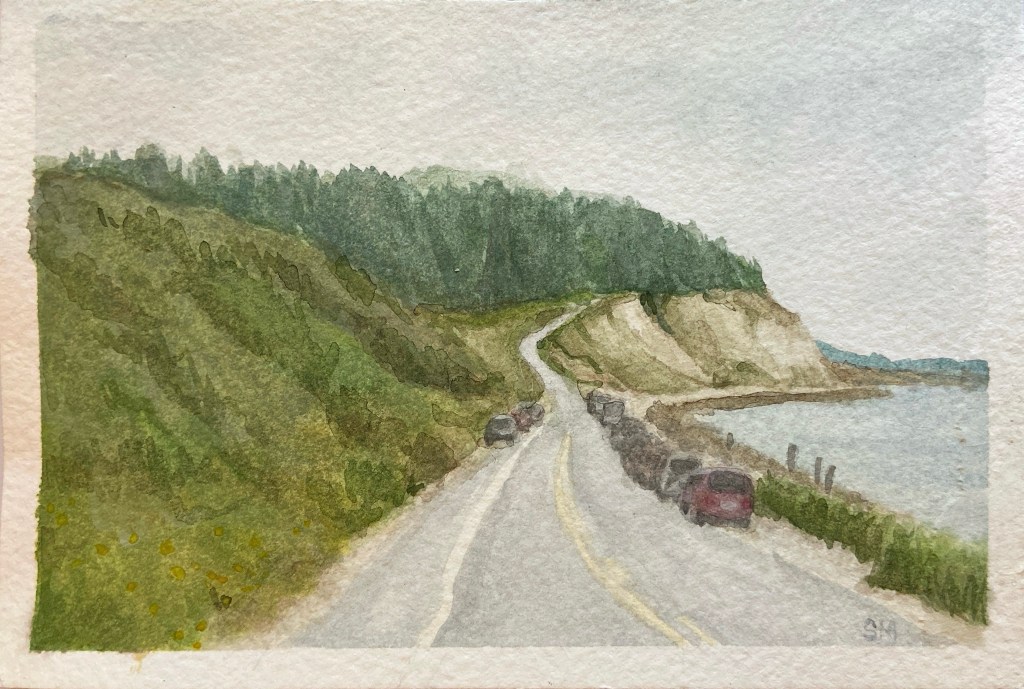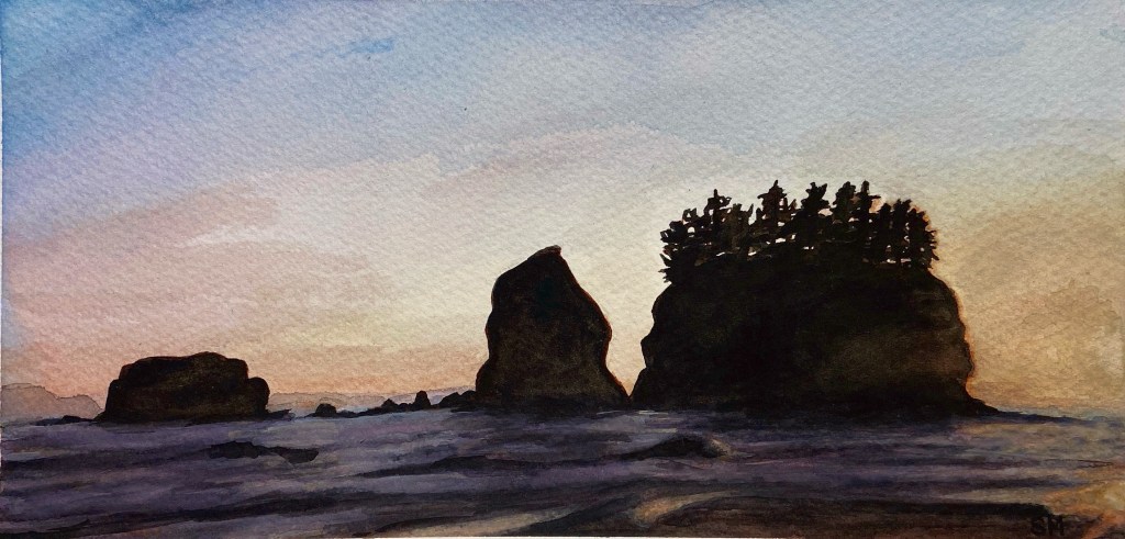 This piece was inspired by a film photo I took on Whidbey Island. After my trip, I went back to Salt Spring Island and brought along my watercolours to keep entertained. I started painting this with it taped to the kitchen counter – unfortunately too close to dinner time. I had to move it and since it was still wet it tore. A little glue fixed it well enough.