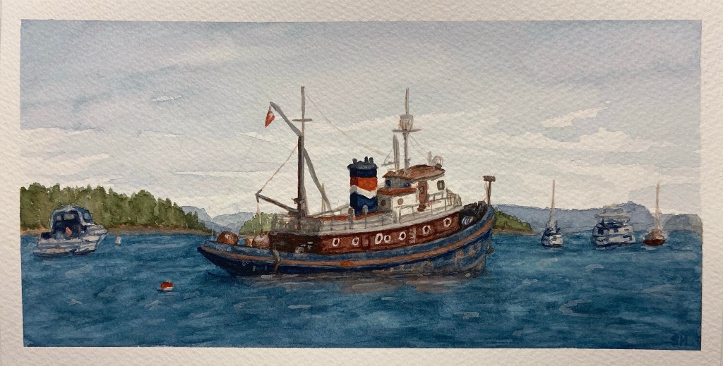 My favourite boat in Ganges harbour is this old tug boat, Seahorse, that has been sitting for many years now. I finally managed to capture a decent photo of it since my SLR can zoom in. Up to this point I’ve been painting every single inch of paper, so here I chose to use negative space for the clouds and bright whites on the boat. I bought this long postcard size watercolour paper in Japan which has been fun to work with.