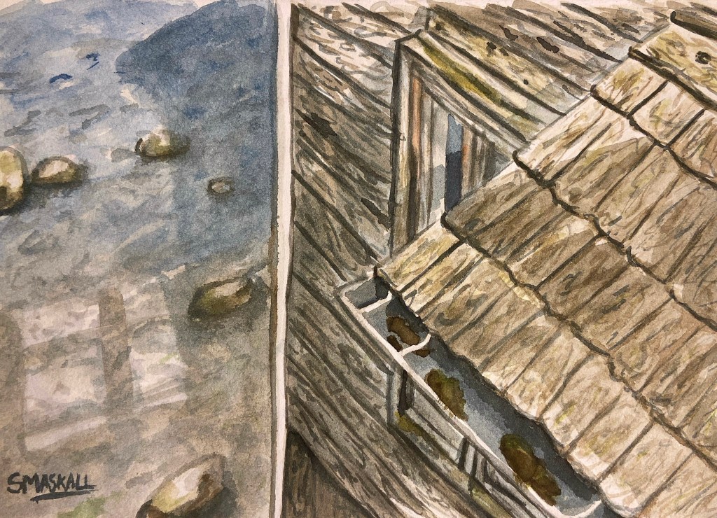 One last watercolour – this is an honorary ‘out of sketchbook’ painting since it was carefully torn out of my sketchbook because I love it so much. Getting the contrast between the glassy water and weathered wood was so much fun. I finally bought a proper watercolour sketchbook and some larger paper so now I’m working on another building.
