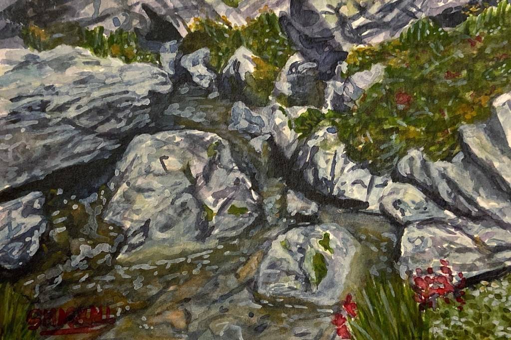 One last recent watercolour – creating the glassy see thru water effect again was very fun. I tried out some new techniques with it. I also wanted to focus on using as many different colours as I could while keeping it realistic so I ended up using a lot of purples, blues, and yellow ochre.