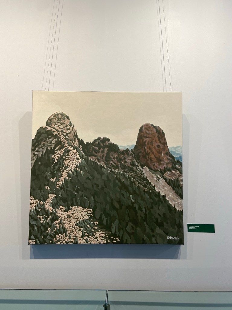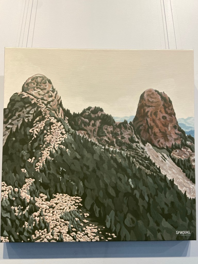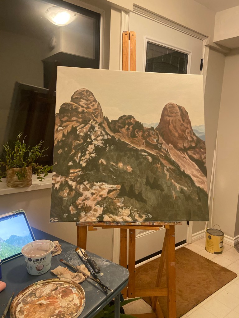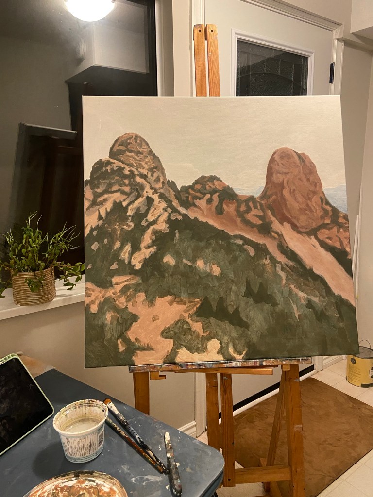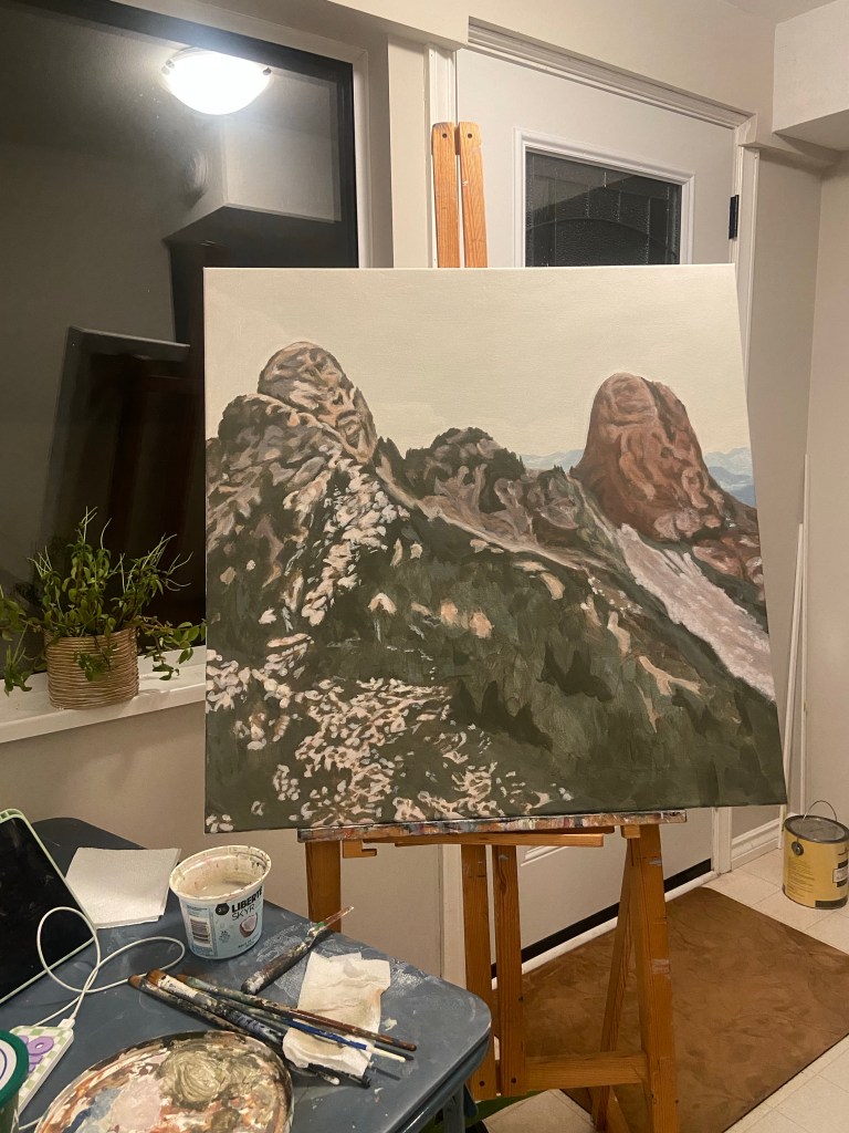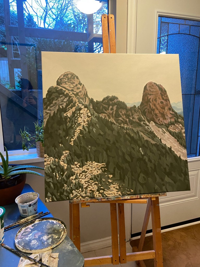 While I’m happy with the finished piece, I still think there were a few things I would have changed if I still had time. And maybe would have workshopped the trees more. But I really love how the rocky mountain tops turned out. Now time to buy more canvas to stretch my next large piece!